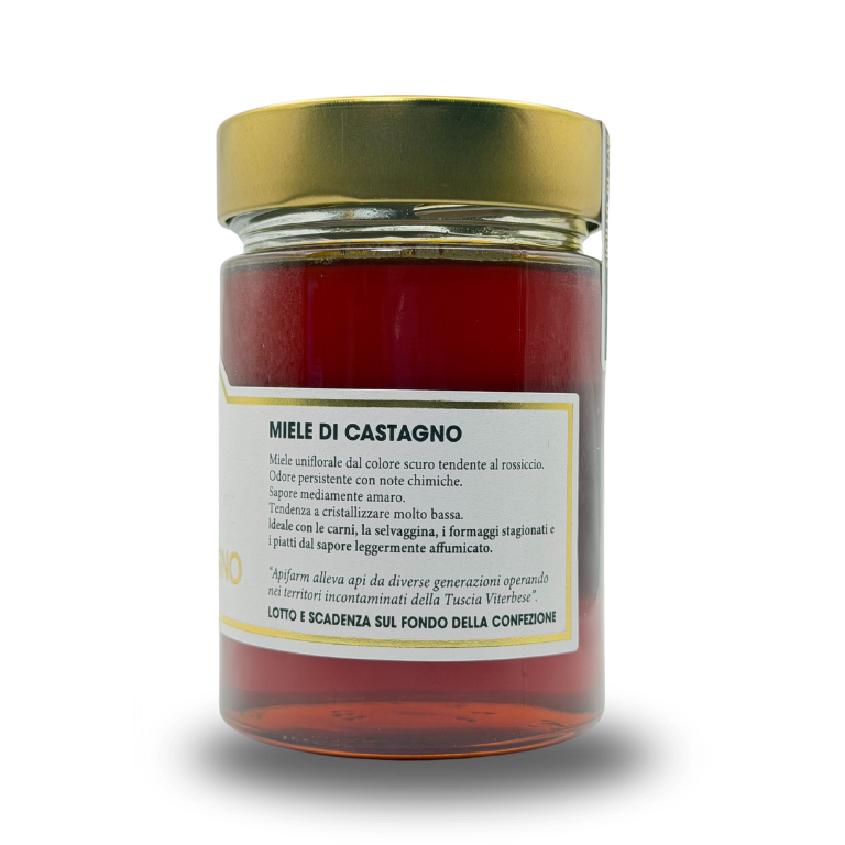 Il castagno (Castanea) è un Genere botanico che appartiene alla Famiglia delle Fagaceae; l’unico esponente europeo autoctono di questo gruppo è proprio la specie C. sativa . Il periodo di fioritura del miele di castagno è tra metà Giugno e i primi di Luglio. Le zone di raccolta sono di tipo collinare e montuoso.