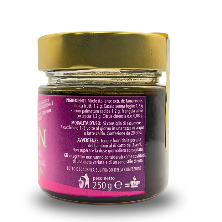 Ingredienti: Miele Millefiori italiano 245g, tamarindo, cassia, rabarbaro, frangula , arancio dolce o.essenziale.